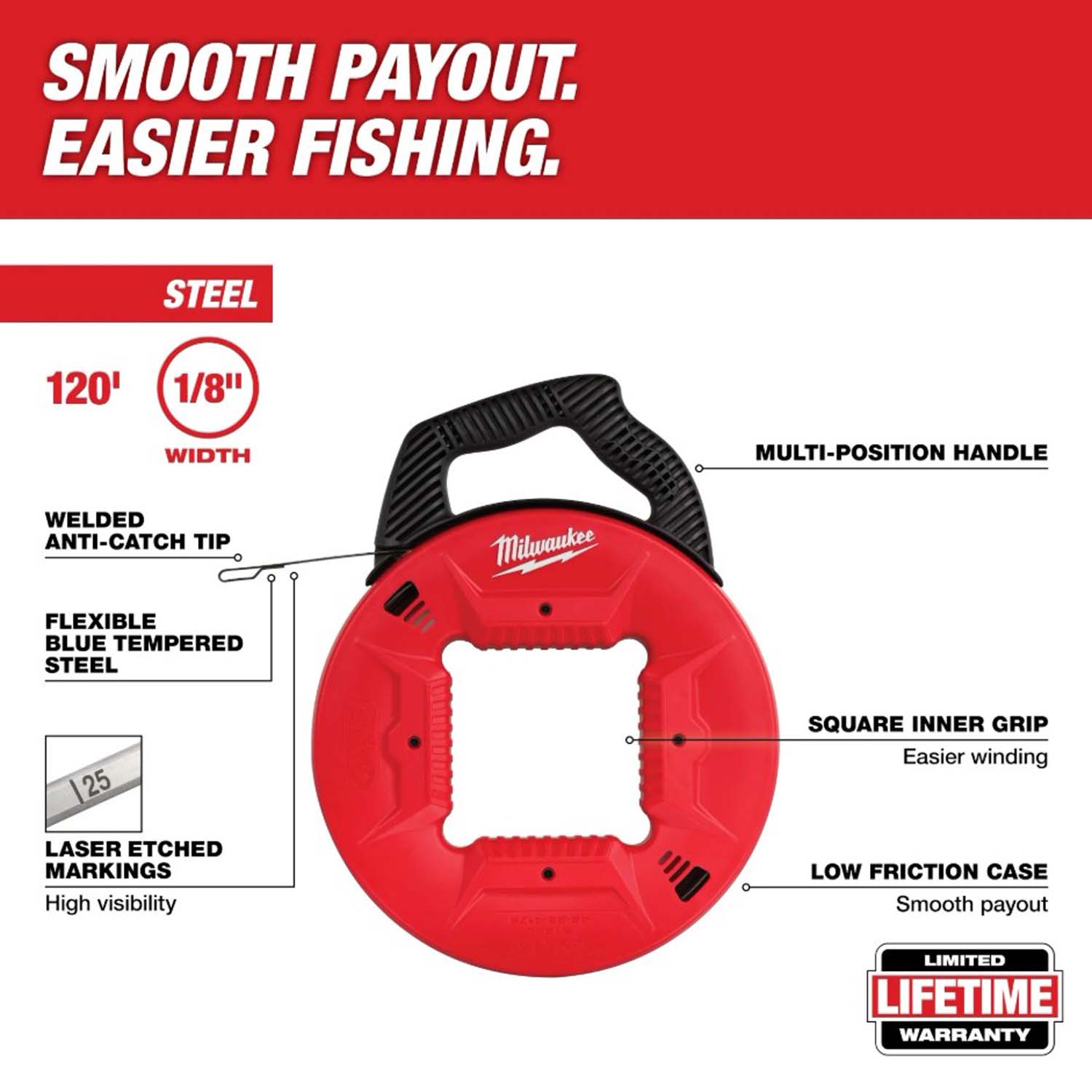 Our Steel Fish Tapes feature a low friction case providing you with smooth payout and easy rewind. High-visibility laser etched markings on the tape allow you to accurately measure depth and position. The blue tempered steel balances strength and flexibility for easier fishing. The fish tape features a multi-position handle allowing you to comfortably use the fish tape in any jobsite scenario.