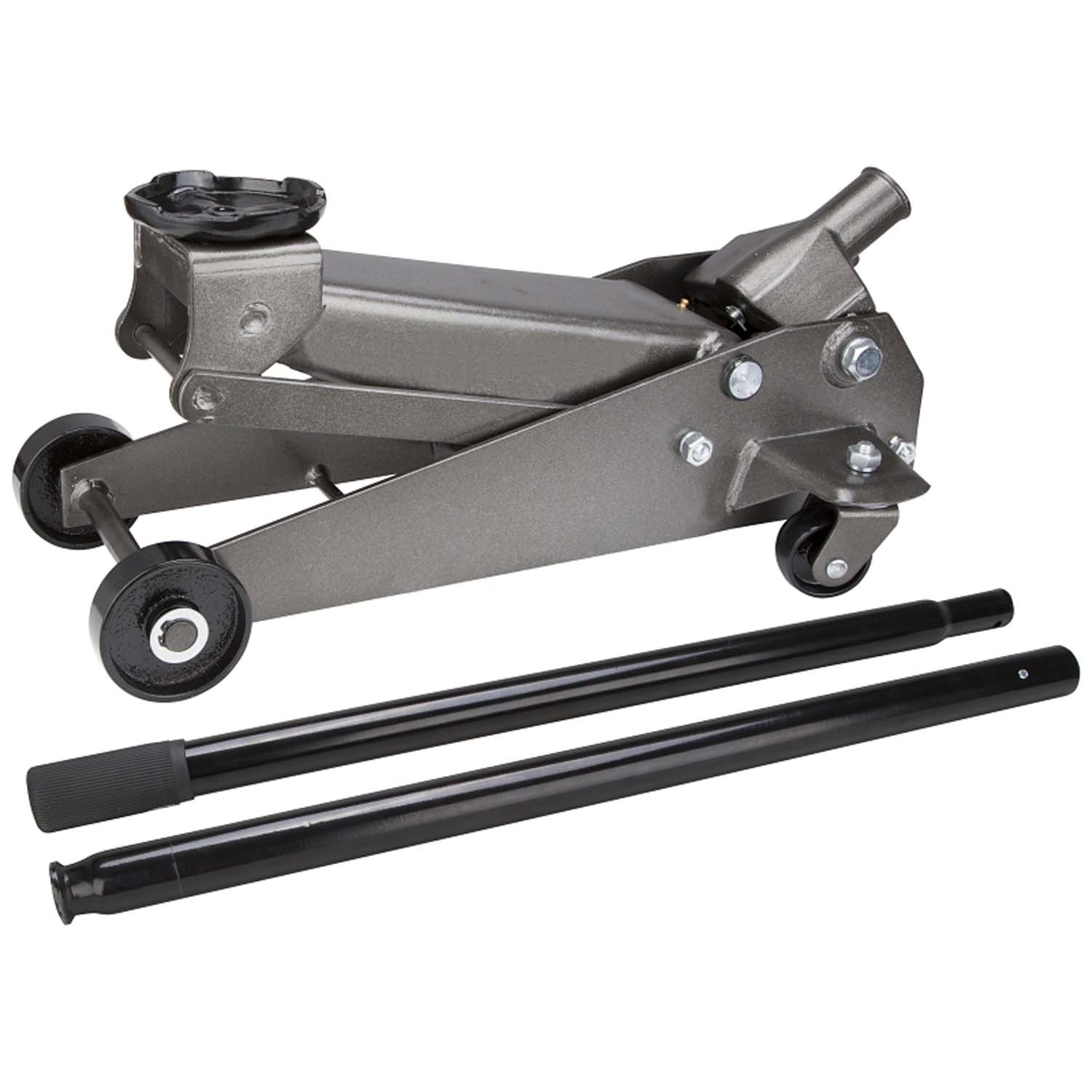Swivel casters, 360 degree for easy rolling. Line bypass prevents over pumping. Rust-resistant, baked enamel finish for durability. 2-1/2 ton offers 5000 lbs capacity or 5-5/16 to 19-5/16 in lifting range.