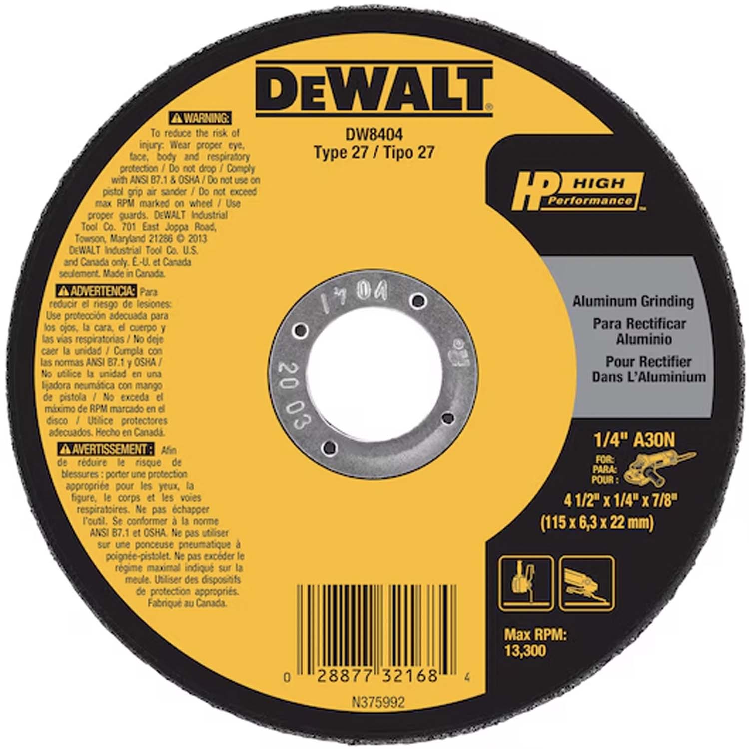 Designed to provide aggressive material removal and long wheel life, DEWALT Type 27 HP Aluminum Grinding Wheels grind aluminum and other non-ferrous metals without loading. Crafted from aluminum oxide grain for long wheel life.