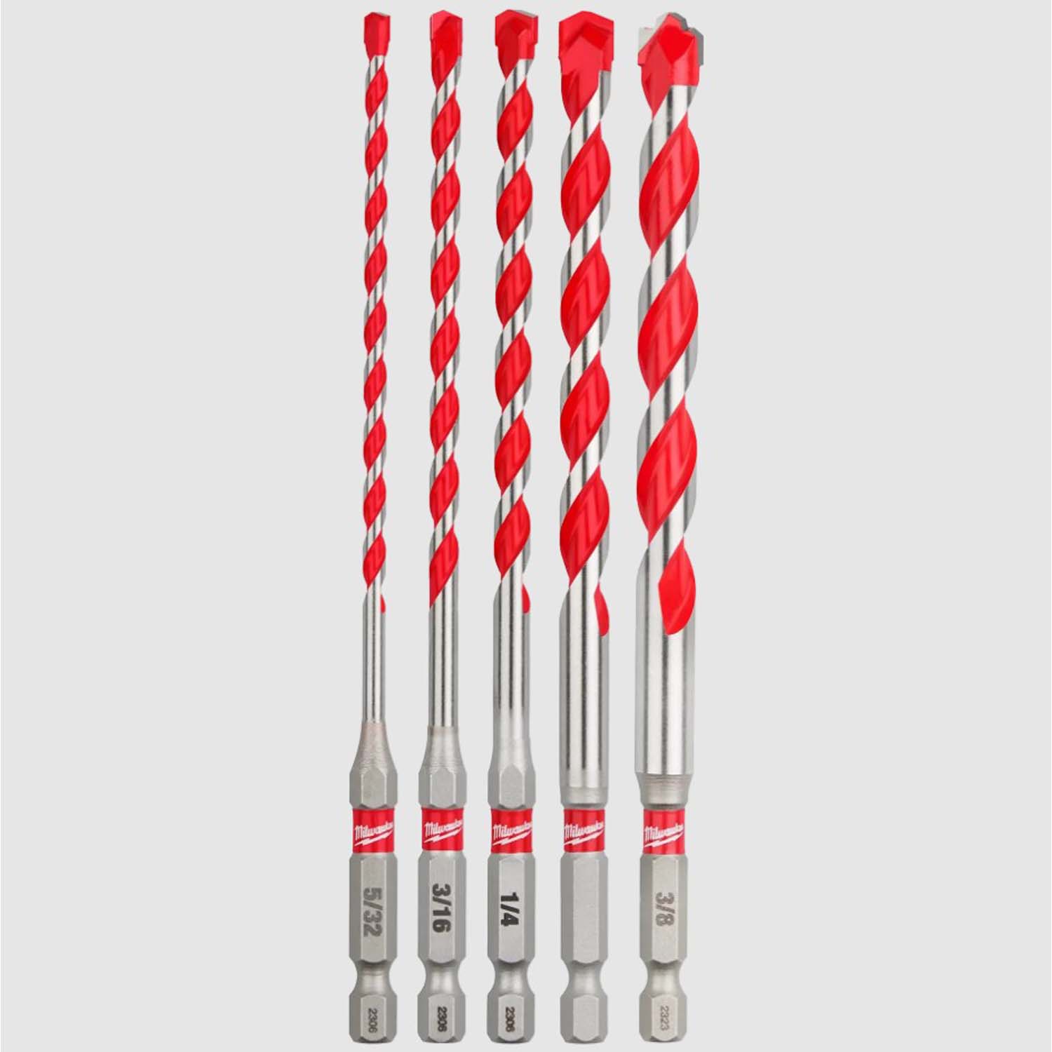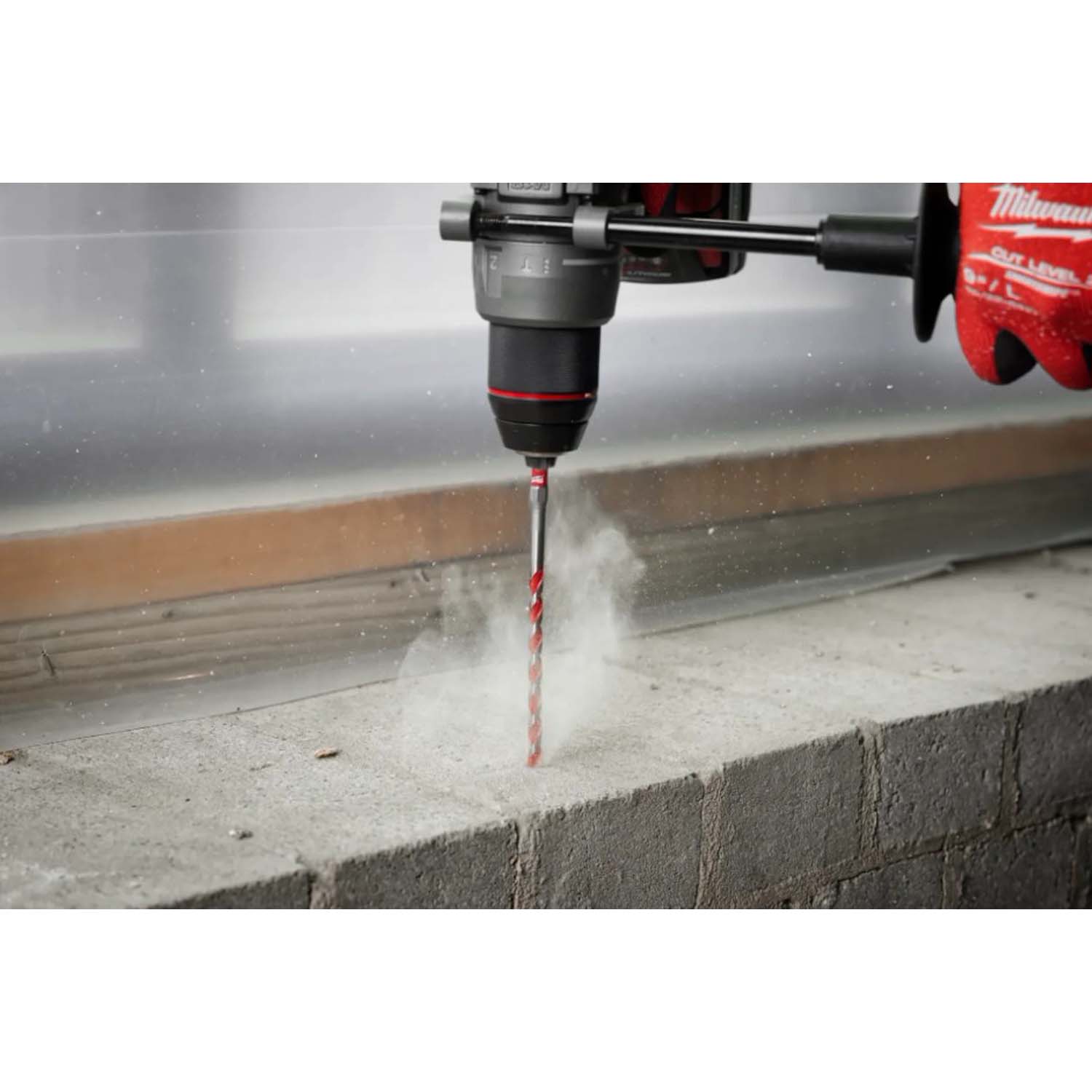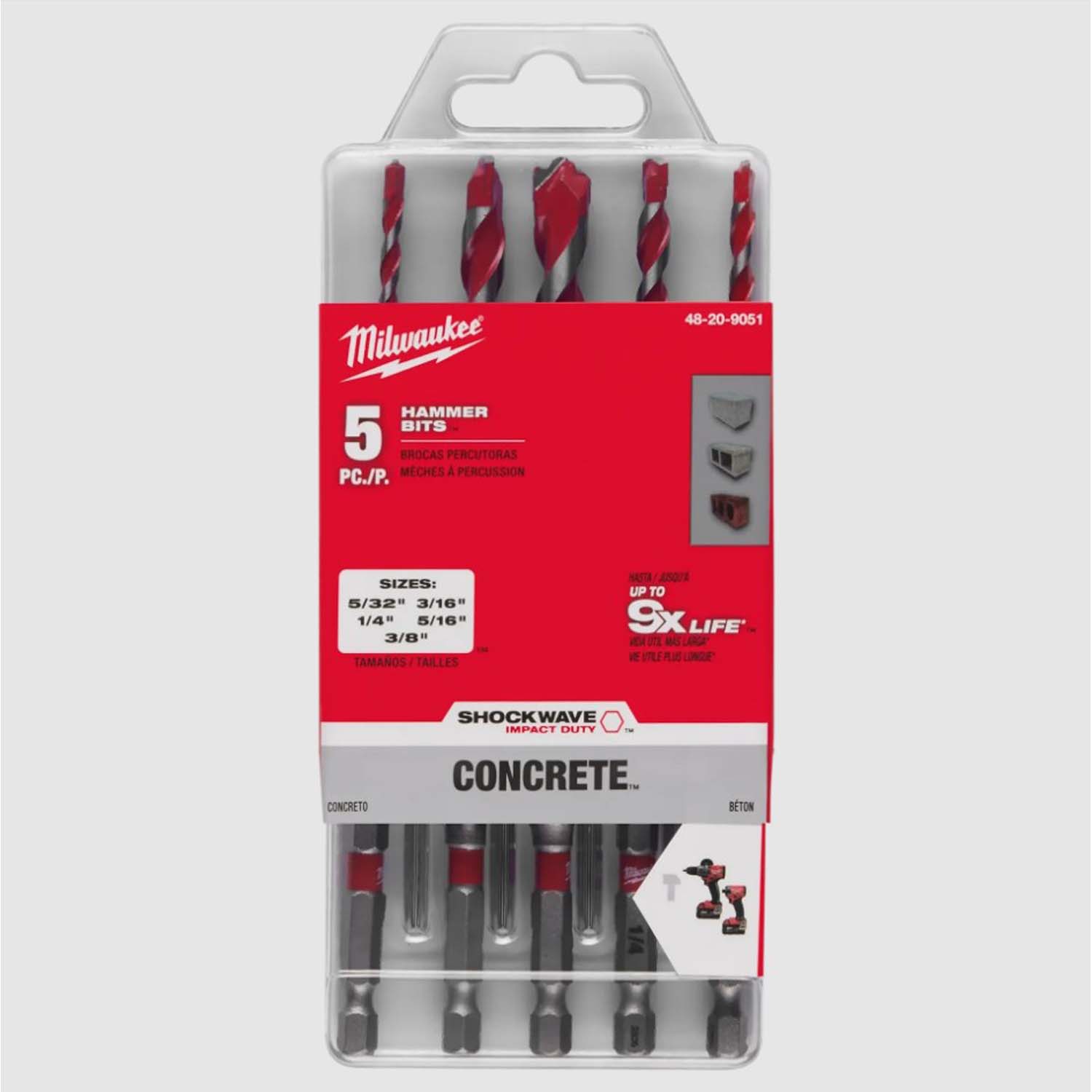 Our SHOCKWAVE Impact Duty™ Carbide Hammer Drill Bits are designed with sharpened carbide to deliver up to 9x longer life and 4x faster drilling into concrete. The POWER TIP™, available in sizes 3/8" and above, is designed with dynamic cutting edges and a chip breaker for increased productivity and easier drilling from start to finish. Engineered with precision ground carbide, these bits deliver faster starts and less walking in concrete, brick, and block. Wide flute design removes dust faster, reducing heat and delivering more holes per charge. Equipped with a ¼” Hex Shank, Milwaukee® SHOCKWAVE Impact Duty™ Carbide Hammer Drill Bits are the ideal solution for drilling in masonry materials with both impacts and hammer drills/drivers.