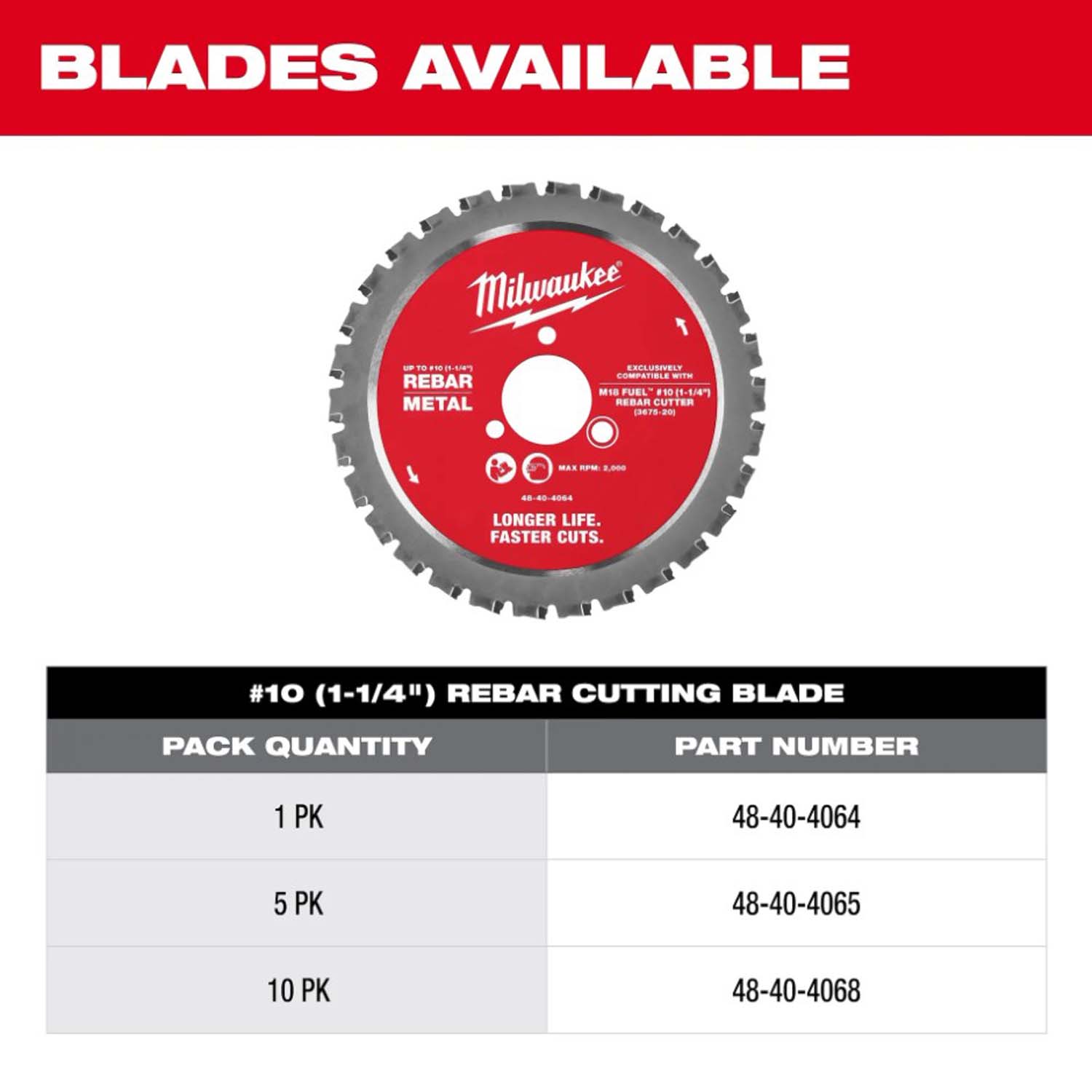 - The exclusively compatible Milwaukee® #10 (1-1/4") Rebar Cutting Blade (48-40-4064) easily cuts rebar with less sparks than an abrasive wheel.