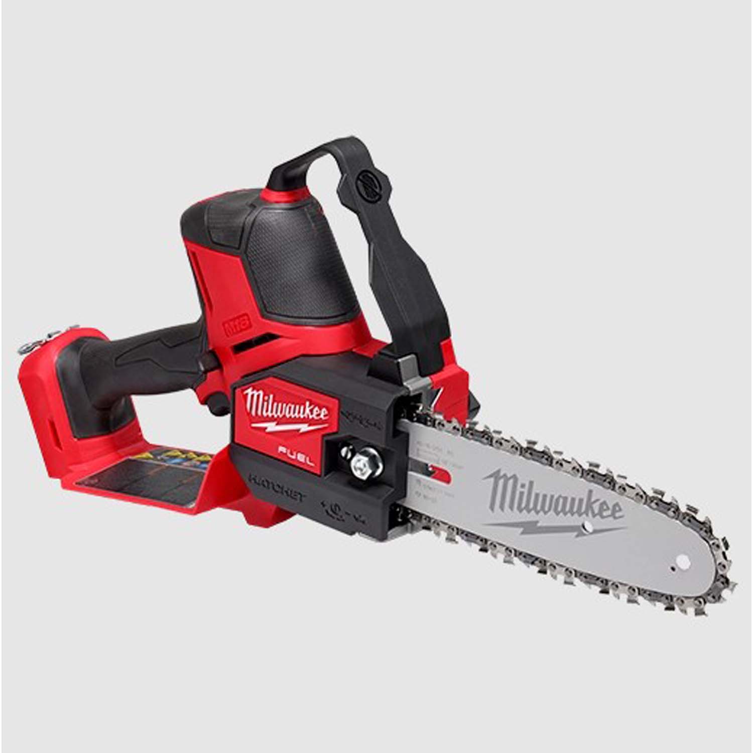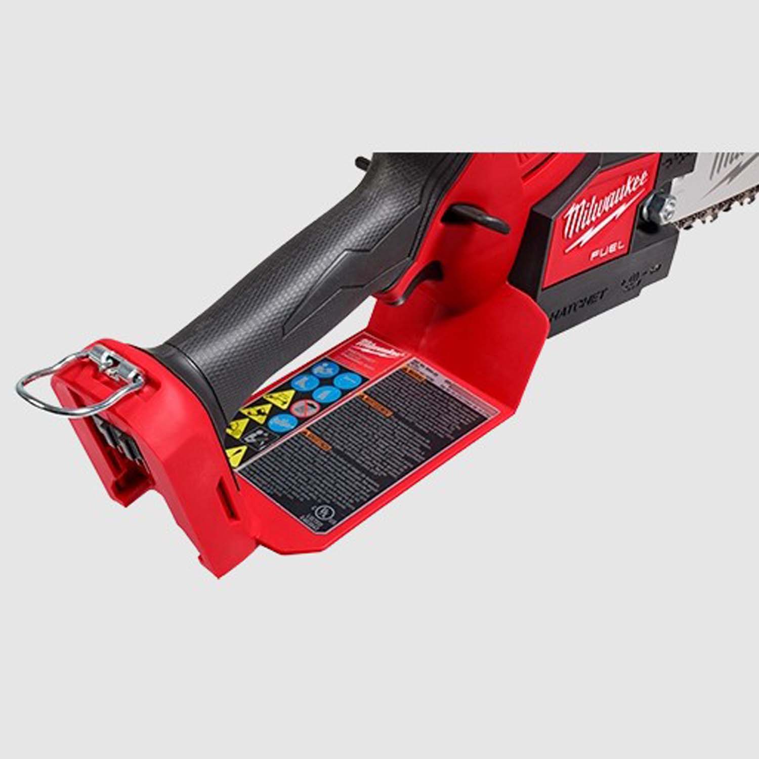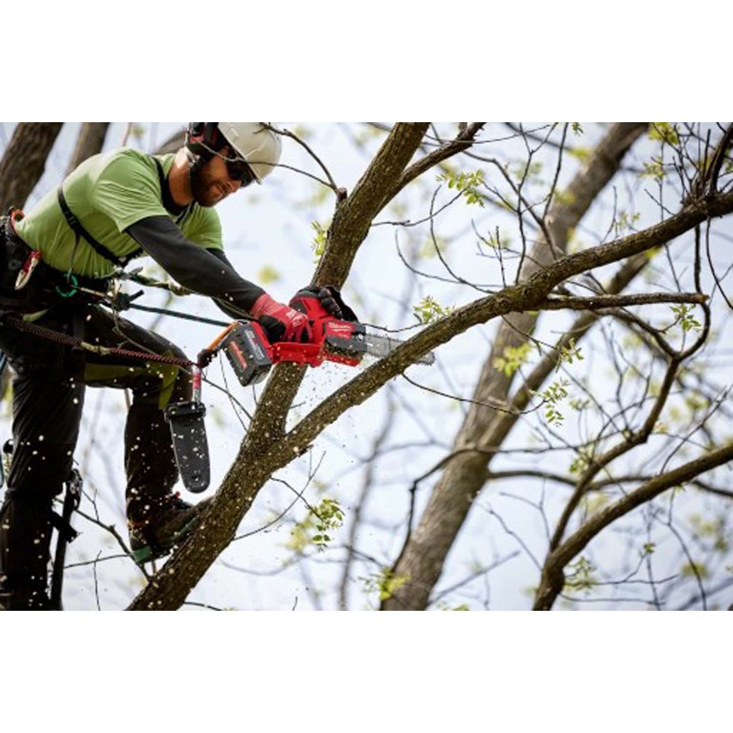 Our MILWAUKEE® M18 FUEL™ HATCHET™ 8" Pruning Saw delivers increased control & access, has the power to cut hardwoods, and is the fastest cutting pruning saw. This pruning saw is designed to meet the ergonomic, performance, and durability needs of the professional arborist, landscape maintenance professional, and power utility linemen. Weighing less than 5lbs without a battery and featuring a compact design, the cordless pruning saw provides increased control and maneuverability in tight access areas. The POWERSTATE™ Brushless Motor maintains speed under heavy loads without bogging down to complete demanding cuts faster than 25cc gas. The REDLINK PLUS™ Intelligence enables full-circle communication between the tool and battery, allowing for unmatched performance, protection, and productivity levels. M18 FUEL™ technology enables the saw to reach full throttle in under 1 second and a variable speed trigger for ultimate control over the power range. This pruning saw features a lanyard loop, full house chain, easy access chain tensioner, automatic oiler, metal bucking spikes, onboard scrench storage, lanyard loop, and a climbing scabbard. The M18 FUEL™ HATCHET™ 8" Pruning Saw is fully compatible with 250+ solutions on the M18™ system.
