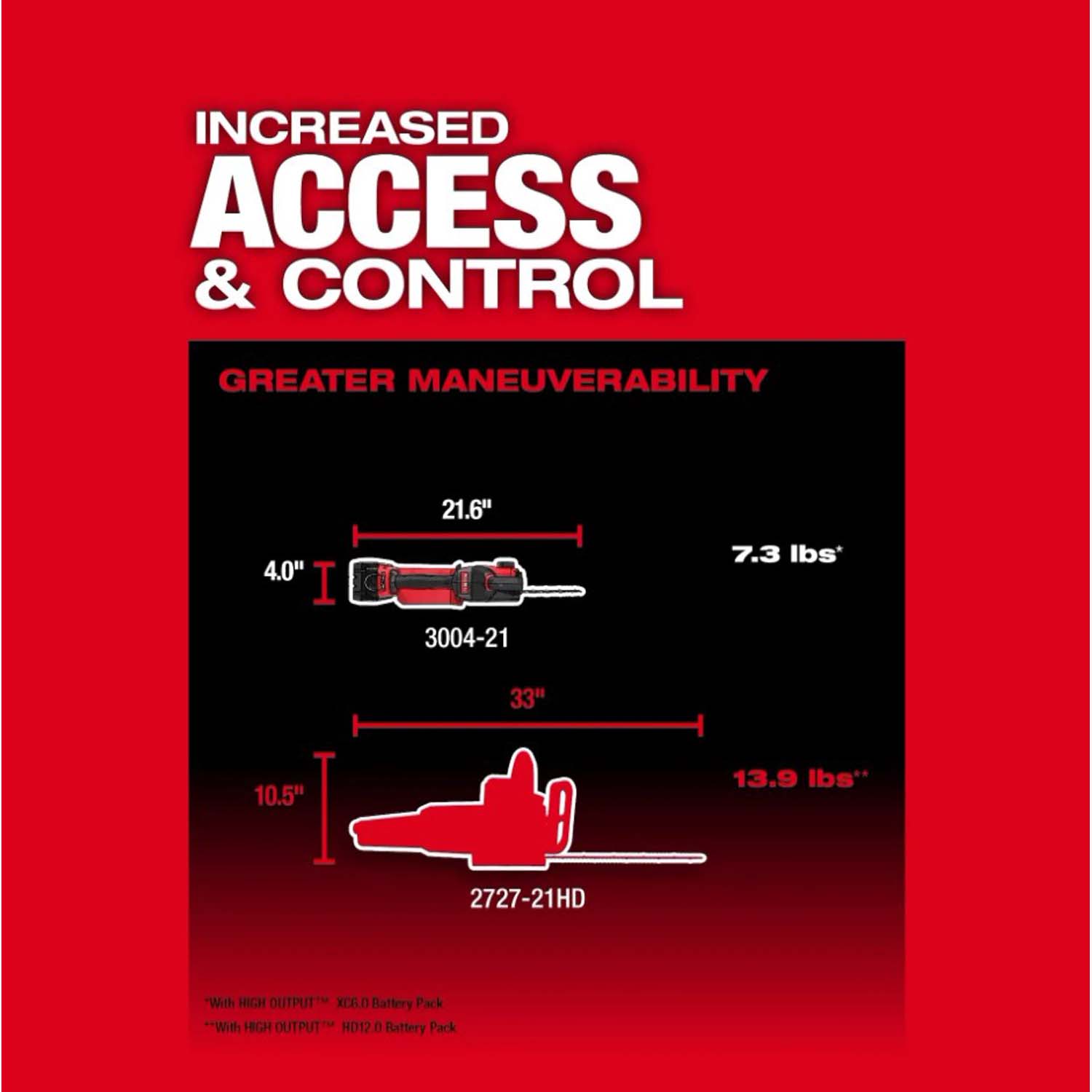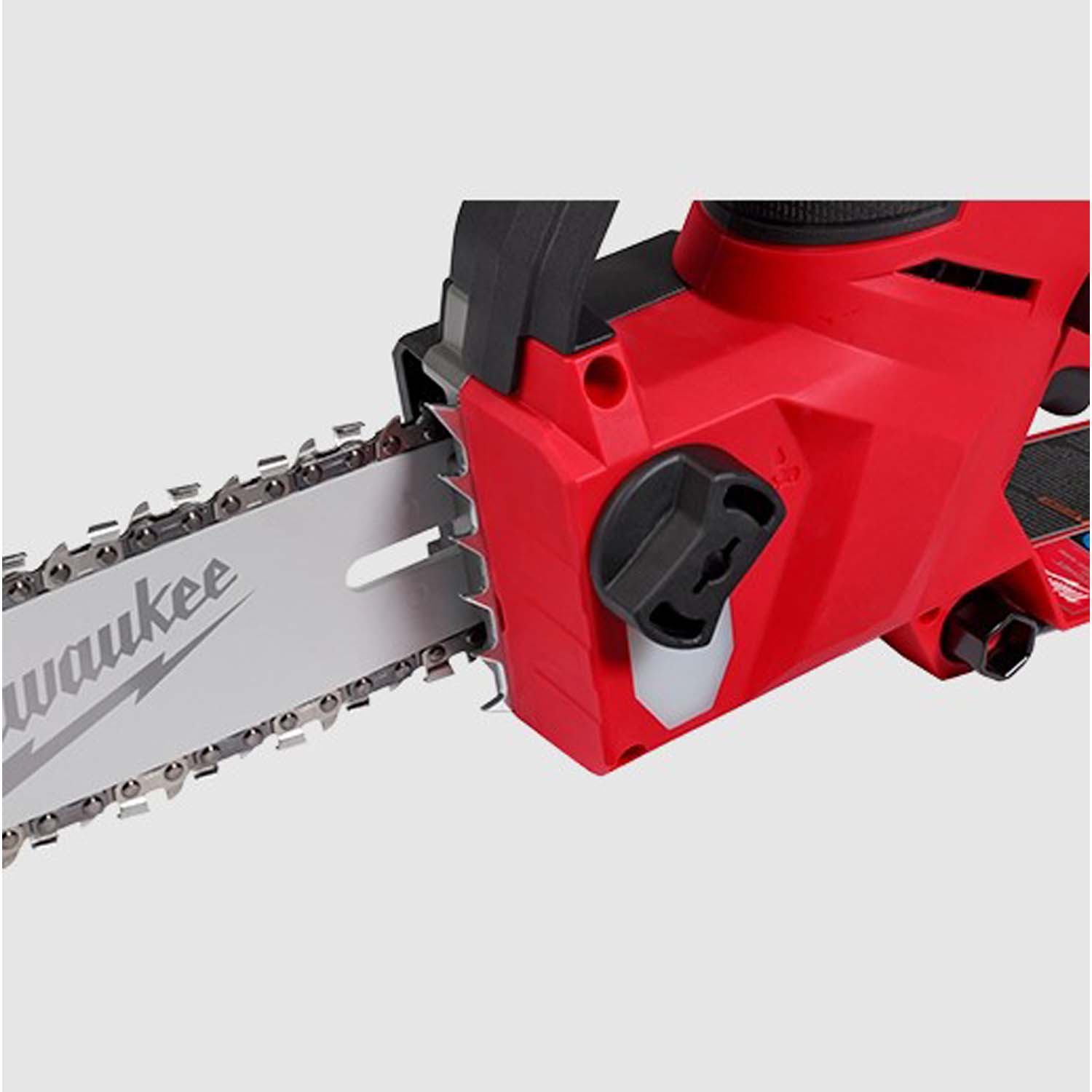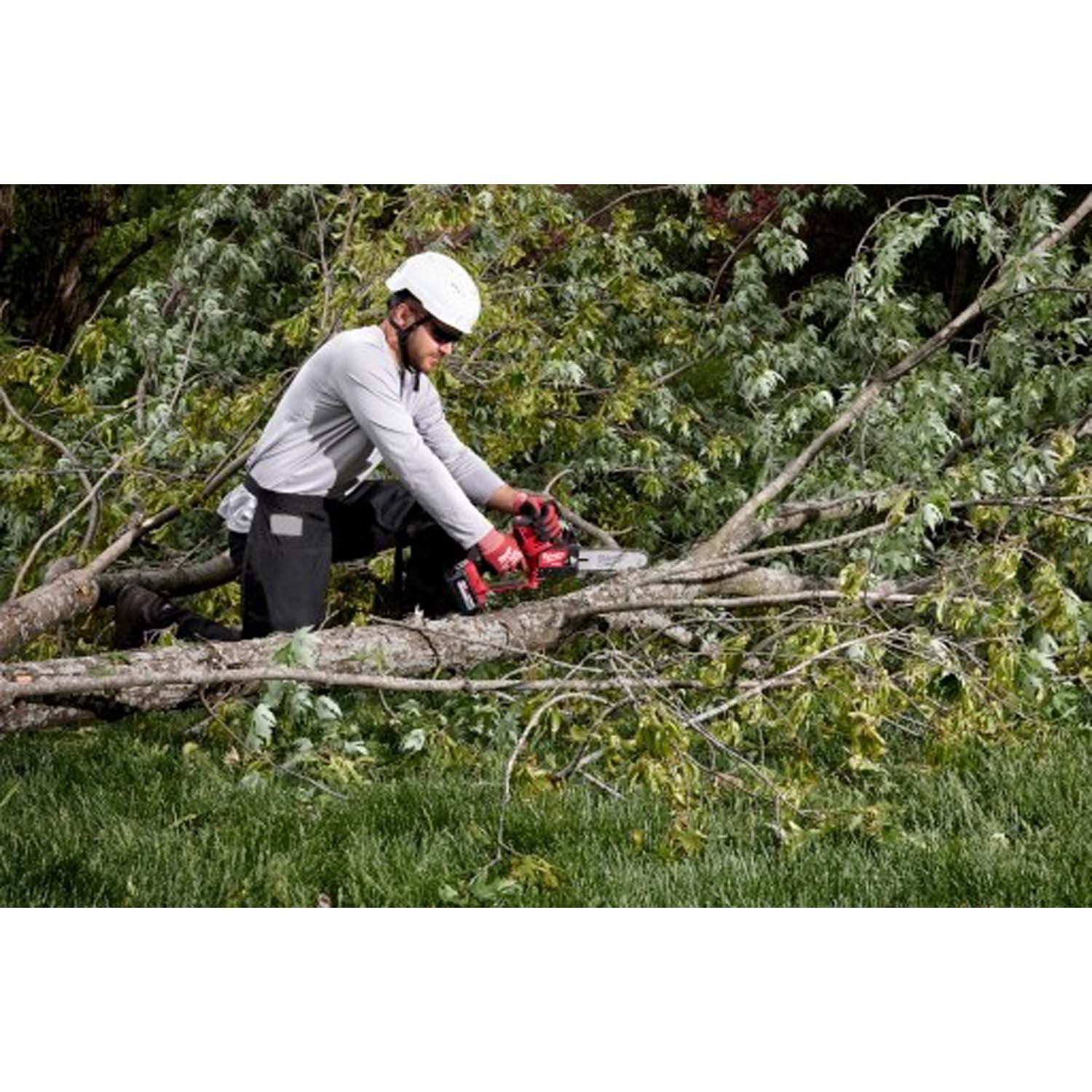 Our MILWAUKEE® M18 FUEL™ HATCHET™ 8" Pruning Saw delivers increased control & access, has the power to cut hardwoods, and is the fastest cutting pruning saw. This pruning saw is designed to meet the ergonomic, performance, and durability needs of the professional arborist, landscape maintenance professional, and power utility linemen. Weighing less than 5lbs without a battery and featuring a compact design, the cordless pruning saw provides increased control and maneuverability in tight access areas. The POWERSTATE™ Brushless Motor maintains speed under heavy loads without bogging down to complete demanding cuts faster than 25cc gas. The REDLINK PLUS™ Intelligence enables full-circle communication between the tool and battery, allowing for unmatched performance, protection, and productivity levels. M18 FUEL™ technology enables the saw to reach full throttle in under 1 second and a variable speed trigger for ultimate control over the power range. This pruning saw features a lanyard loop, full house chain, easy access chain tensioner, automatic oiler, metal bucking spikes, onboard scrench storage, lanyard loop, and a climbing scabbard. The M18 FUEL™ HATCHET™ 8" Pruning Saw is fully compatible with 250+ solutions on the M18™ system.
