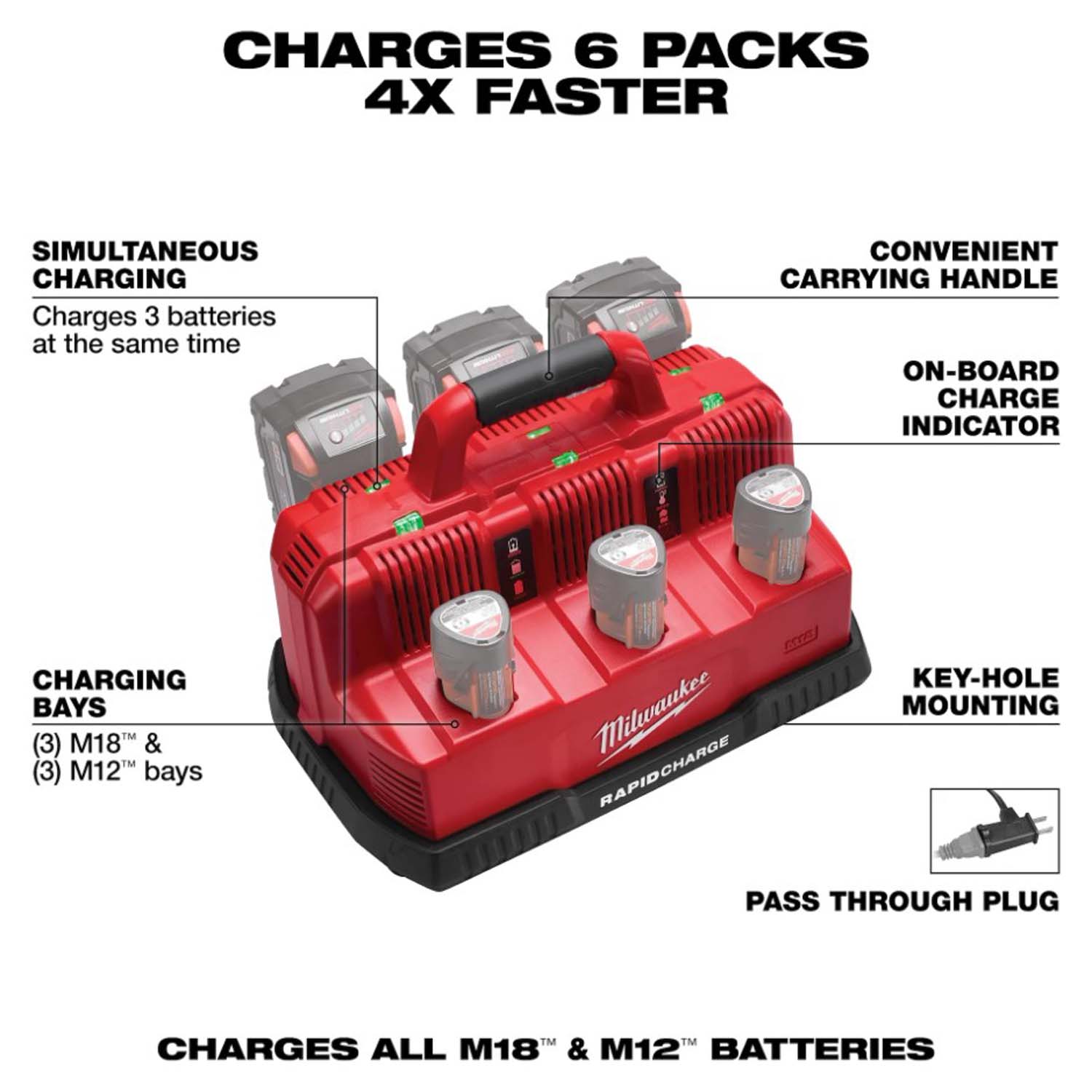 The M18™ & M12™ Rapid Charge Station is the fastest charging solution in the industry. With the ability to Charge 6 Packs 4X Faster, the station charges three batteries simultaneously while charging each pack up to 40% faster. The charger accepts up to (3) M18™ & (3) M12™ battery packs, reducing the amount of time spent changing out batteries and increasing productivity on the jobsite. Featuring REDLINK™ Intelligence, it communicates directly with the battery to monitor cell voltage, temperature, and charge status to optimize the performance and extend the life of the pack. The station has integrated hang holes for vertical mounting, a pass through plug to conserve outlet space, and a convenient carry handle to transport packs on and off the jobsite.
