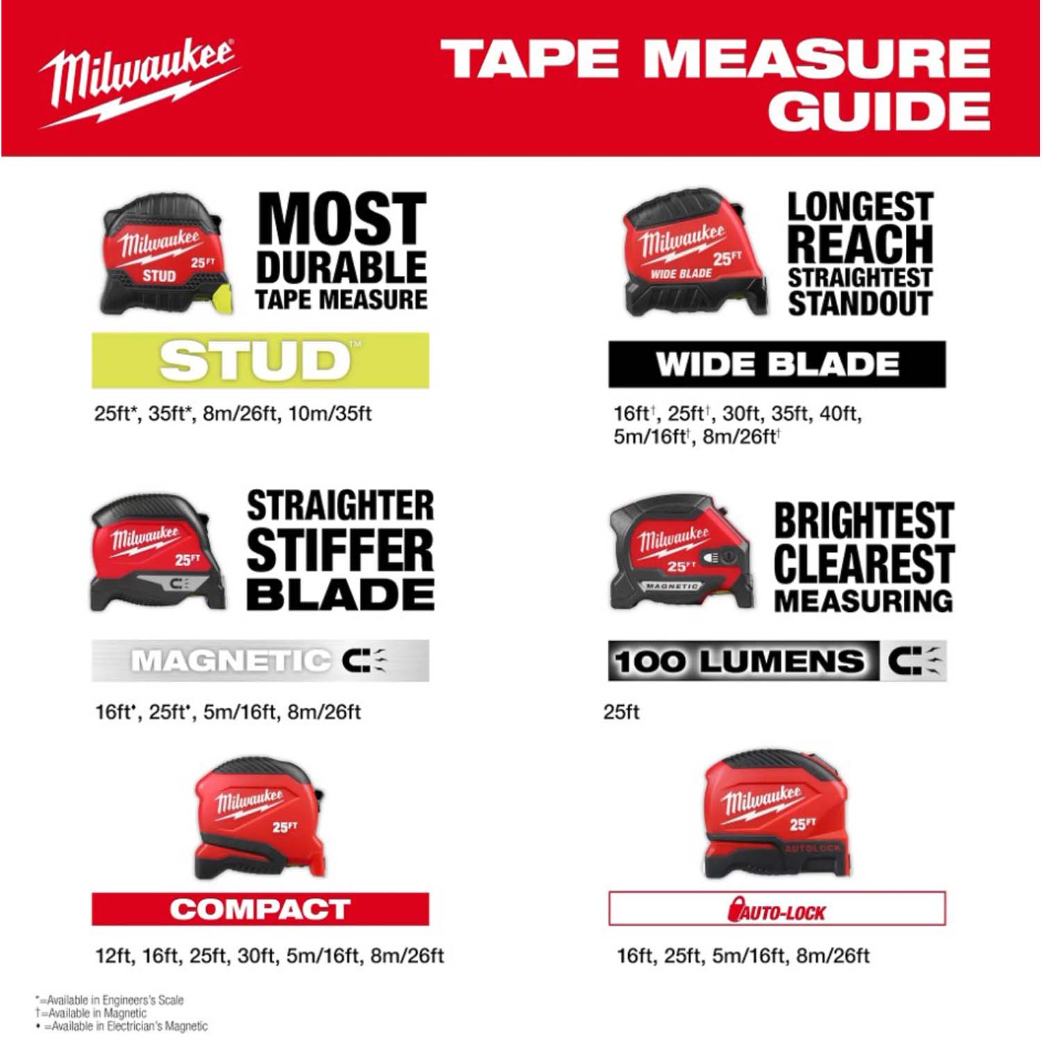 Our Wide Blade Tape Measure delivers the longest reach and straightest standout in the industry. The Wide Blade Tape Measure features a finger stop for quick, controlled blade retraction and double-sided anti-tear coating that reinforces the first 6” of the blade. This tape measure is equipped with a large hook for improved top and bottom hook grab onto common jobsite materials and double-sided printing for measuring in different orientations. Built to withstand the jobsite, this tape has a fully reinforced impact resistant body and a wire form belt clip to reduce pocket tearing.