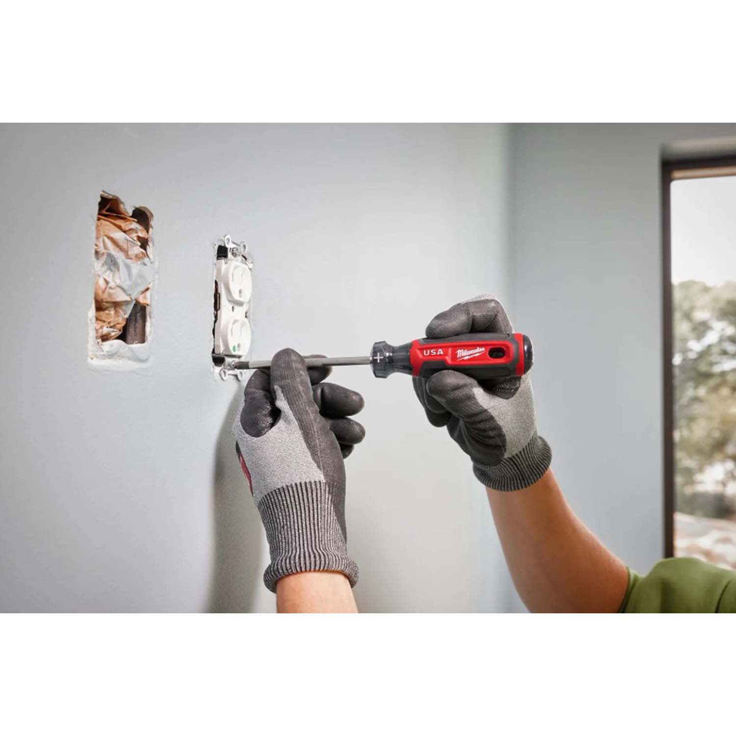 Our Milwaukee® Cushion Grip Screwdriver Sets (USA) are manufactured to give the professional the best-fitting screwdriver with max grip. Our screwdriver tips are custom machined to deliver a precise fit and reduce stripping during demanding fastening applications. For added confidence, the tips are laser etched to increase the gripping surface. Manufactured with high-strength, boron-infused steel for increased hardness, our screwdrivers stand up to the demands of the site with ultimate durability and life. Providing increased versatility, select screwdrivers include a wrench-ready bolster for added torque and a knurled shank for precision control. Quick identification markings on the handle make it easy to identify screwdriver tip size, including Phillips, slotted, and cabinet tips. The 4-Piece and 6-Piece sets include screwdrivers offered in 3-inch, 4-inch, and 6-inch shank lengths. Our Milwaukee Cushion Grip Screwdriver Sets are made in the USA with cutting-edge manufacturing technology and the highest-quality, USA-sourced materials all backed by a complete Lifetime Guarantee.
