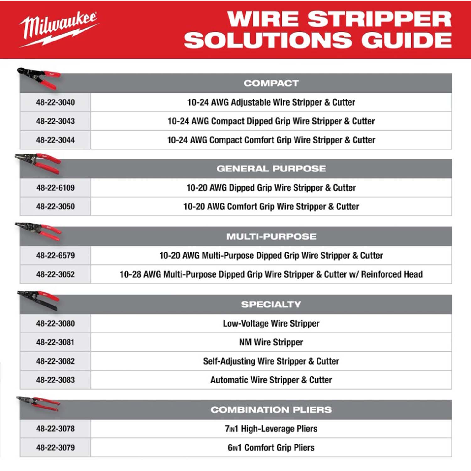 Milwaukee 48-22-6109 Wire Stripper/Cutter for Solid & Stranded Wire feature a swing-lock design for fast one-handed operation, and won’t open when stored in a pouch or backpack. These pliers feature a curved blade design that allows for clean cuts through larger wire sizes and have the capability to cut #6 and #8 bolts. The pliers ergonomic handle form and lightweight design allows for maximum versatility and smooth wire stripping. The Milwaukee 48-22-6109 is perfect for the toughest of jobsites. Milwaukee stands behind their product and offers a Limited Lifetime Warranty with all wire pliers. The Milwaukee 48-22-6109 includes (1) 48-22-6109 Wire Stripper.