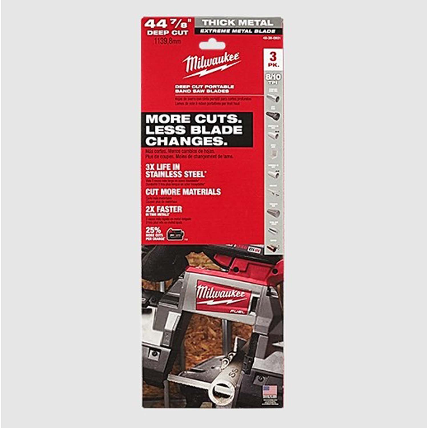 The MILWAUKEE® Extreme Metal Band Saw Blades maximize your band saw blade performance. These blades deliver what you need for daily job site use - more cuts and fewer blade changes. An aggressive variable tooth design gives you the versatility to cut more metals of various thicknesses without changing blades. Our band saw blade sizes are also available in deep cut (44 7/8"), compact (35 3/8"), compact (30-9/16") and sub-compact (27").