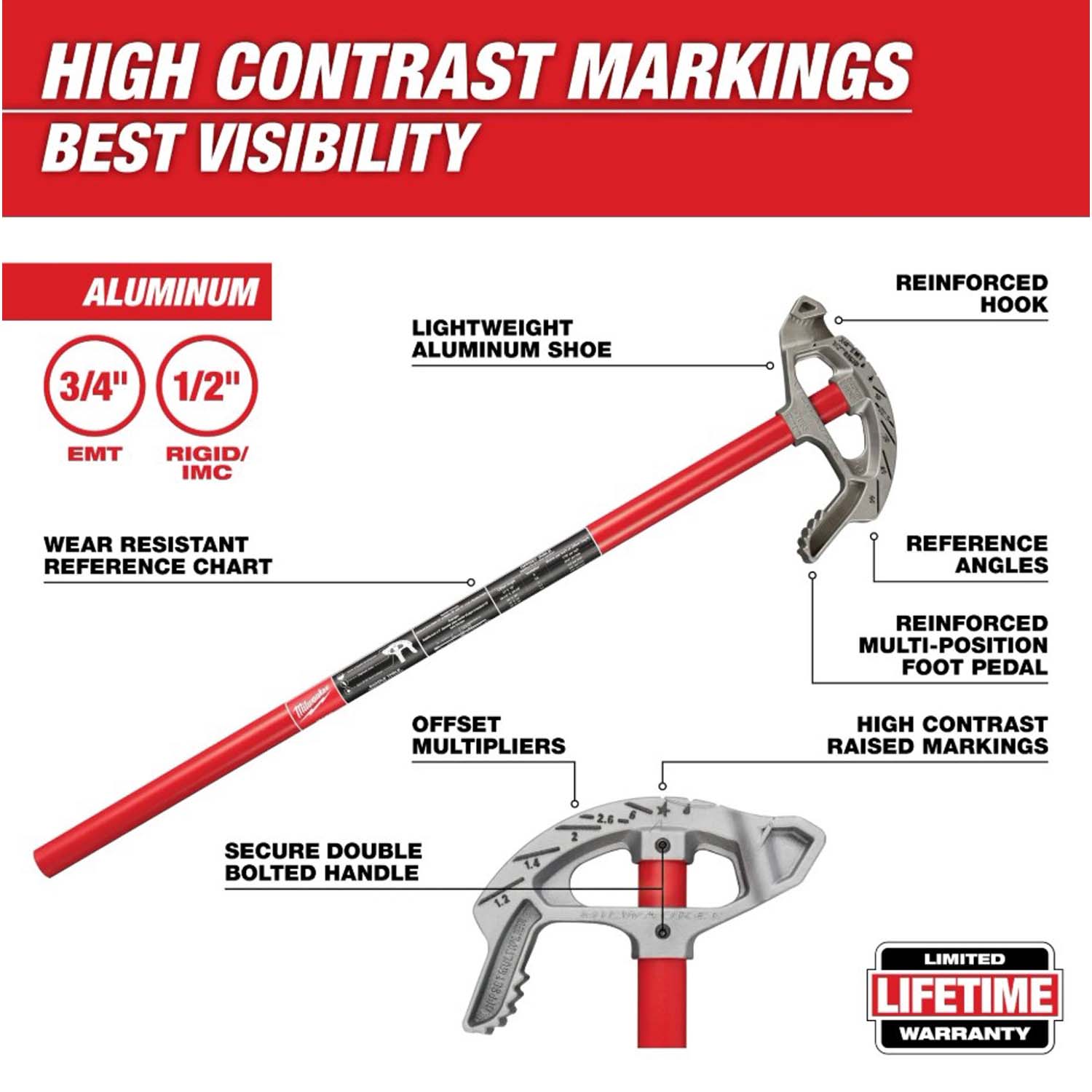 Our EMT Conduit Benders feature high contrast markings for the best visibility allowing you to easily and accurately make bends. A reinforced hook and provide you with added durability while a secure double bolted handle won’t loosen after repeated use. The conduit pipe bender shoe features the most bending references as well as a wear-resistant reference chart for easier use. Offset multipliers are featured on the shoe while 30°, 45°, and 60° center of saddle bend notches and a back of 90° bend indicator allow you to easily and accurately bend conduit.
