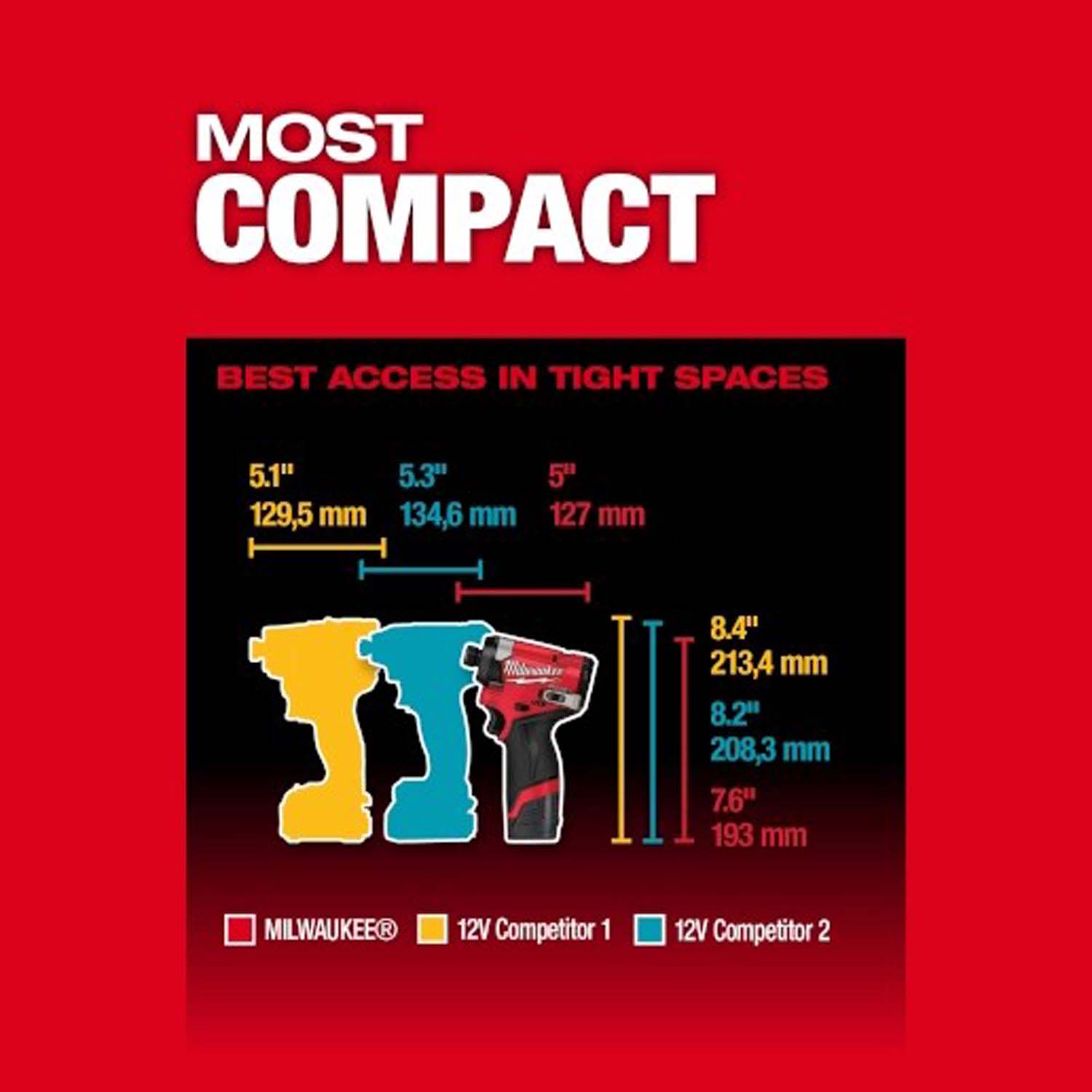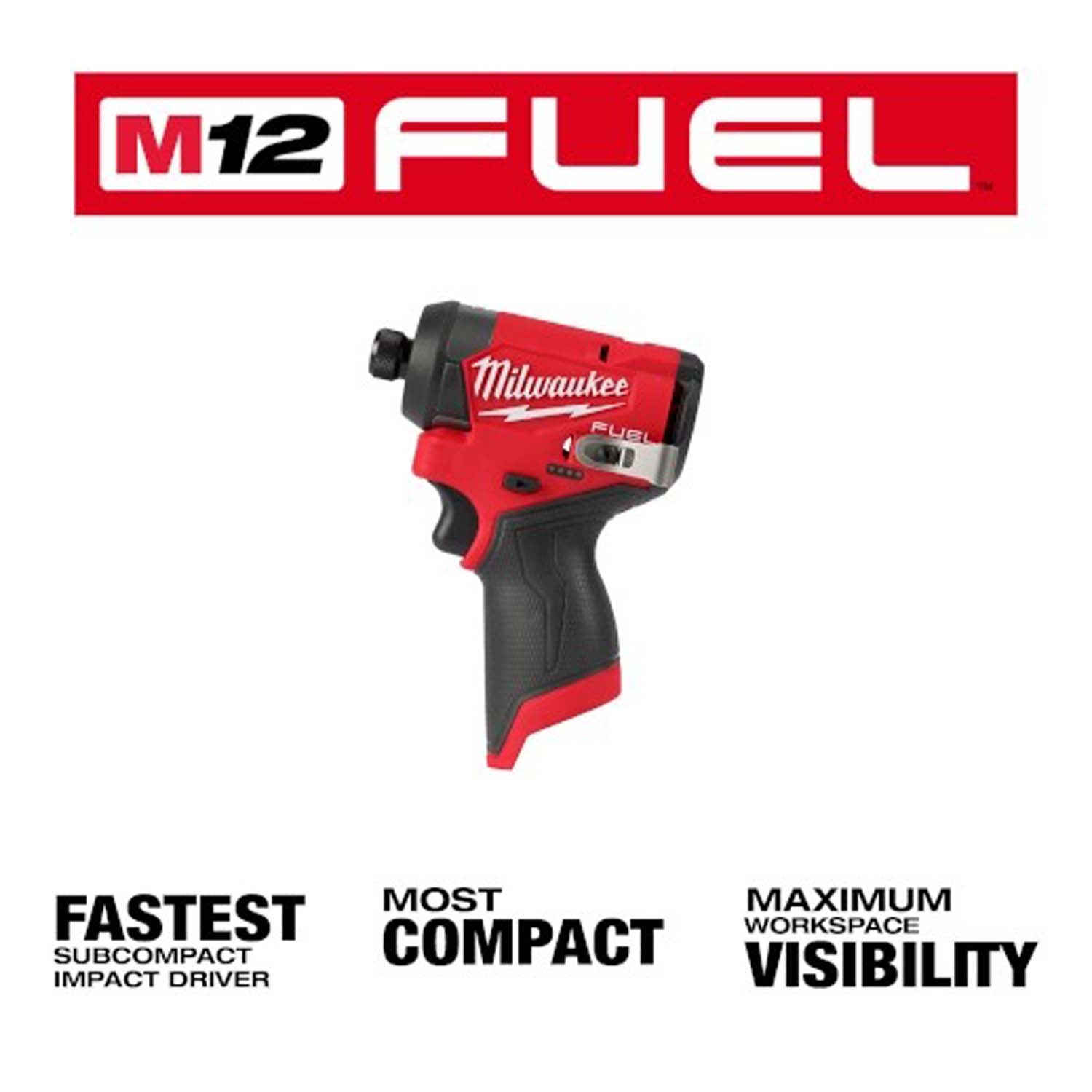 Our M12 FUEL™ 1/4" Hex Impact Driver is the Fastest Subcompact Impact Driver, the Most Compact, and provides Maximum Workspace Visibility. The POWERSTATE™ Brushless motor delivers the fastest driving speeds in the subcompact class for unmatched productivity. At only 5" long and 7.6" tall (with M12™ CP 2.0 Ah battery), this solution is the most overall compact impact driver in class, allowing greater access in tight spaces and overall portability. Tri-LEDs surround the bit accessory with brighter lights and less shadows providing maximum workspace visibility. Our REDLINK PLUS™ Intelligence delivers top of the line thermal performance allowing more work to be completed. Get all day runtime when paired with our M12™ REDLITHIUM™ battery pack. Our M12 FUEL™ Impact Driver is part of our M12™ System which is fully compatible with over 150 solutions.