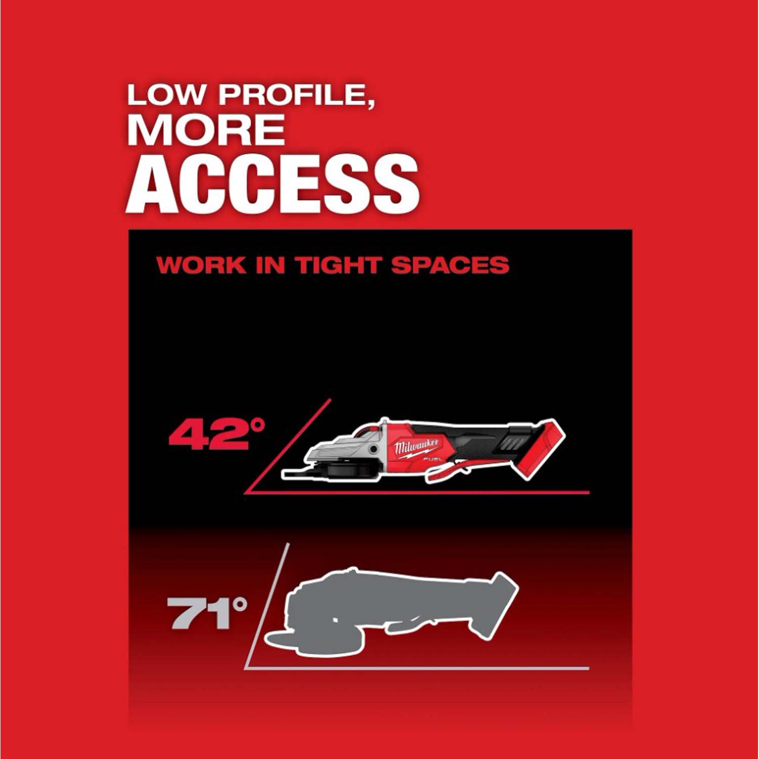 Our M18 FUEL™ 5" Flathead Braking Angle Grinder with Paddle Switch No-Lock is the newest addition to Milwaukee's cordless angle grinder lineup. Generating 11A corded power, a low profile for more access, and RAPIDSTOP™ Brake offers enhanced safety. The POWERSTATE™ Brushless Motor delivers 8,500 RPM and maximum sustained power to complete the toughest grinding and cutting applications, allowing you to push your battery-powered grinders harder and longer than ever before. REDLINK PLUS™ Intelligence ensures unmated levels of performance, protection, and compatibility. The M18™ REDLITHIUM™ HIGH OUTPUT™ XC6.0 Batteries (not included) deliver 50% more power while running 50% cooler than our M18™ REDLITHIUM™ XC Batteries. The low-profile, flathead design allows for greater accessibility to tight spaces. The MILWAUKEE® M18 FUEL™ 5" Flathead Braking Angle Grinder provides enhanced performance, run-time, and accessibility.