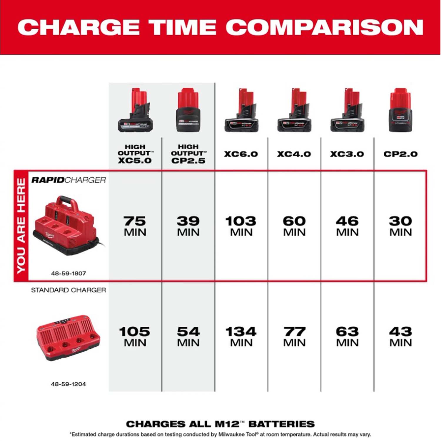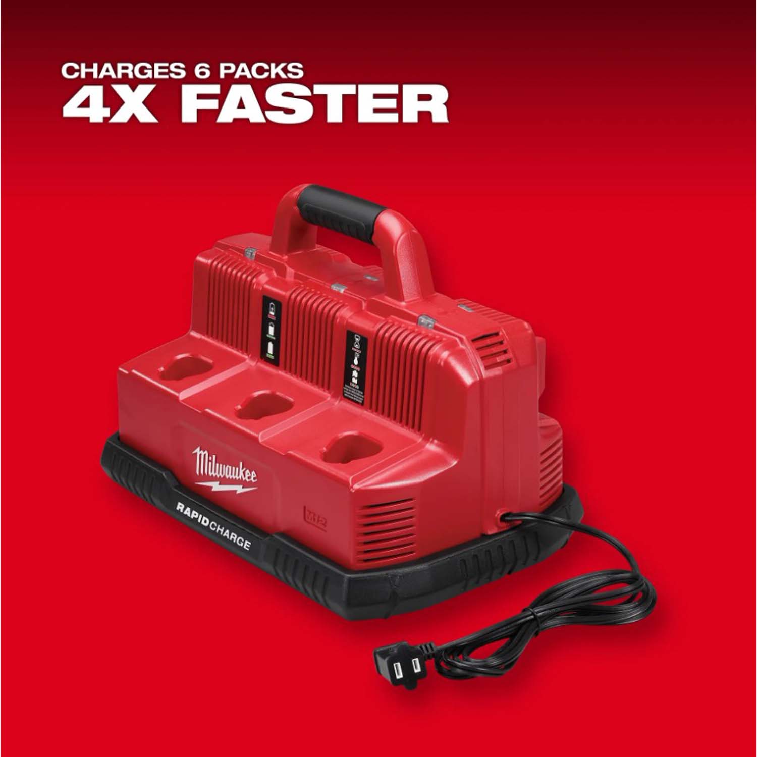 The M18™ & M12™ Rapid Charge Station is the fastest charging solution in the industry. With the ability to Charge 6 Packs 4X Faster, the station charges three batteries simultaneously while charging each pack up to 40% faster. The charger accepts up to (3) M18™ & (3) M12™ battery packs, reducing the amount of time spent changing out batteries and increasing productivity on the jobsite. Featuring REDLINK™ Intelligence, it communicates directly with the battery to monitor cell voltage, temperature, and charge status to optimize the performance and extend the life of the pack. The station has integrated hang holes for vertical mounting, a pass through plug to conserve outlet space, and a convenient carry handle to transport packs on and off the jobsite.