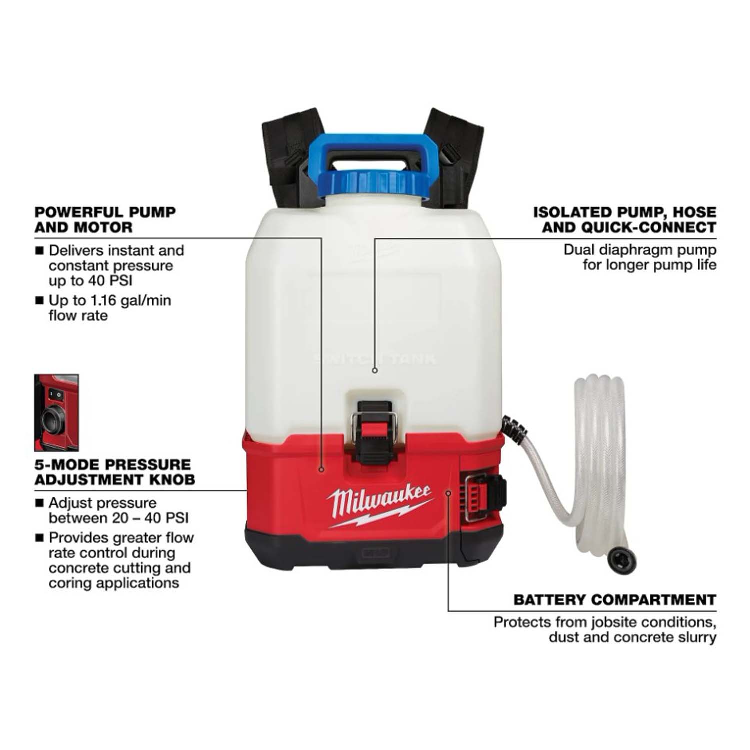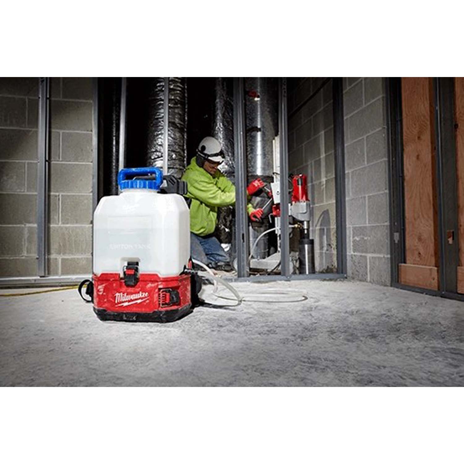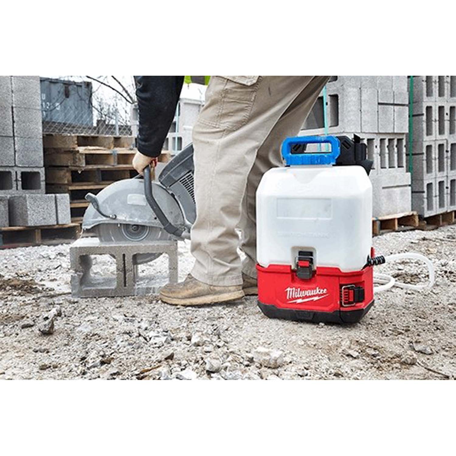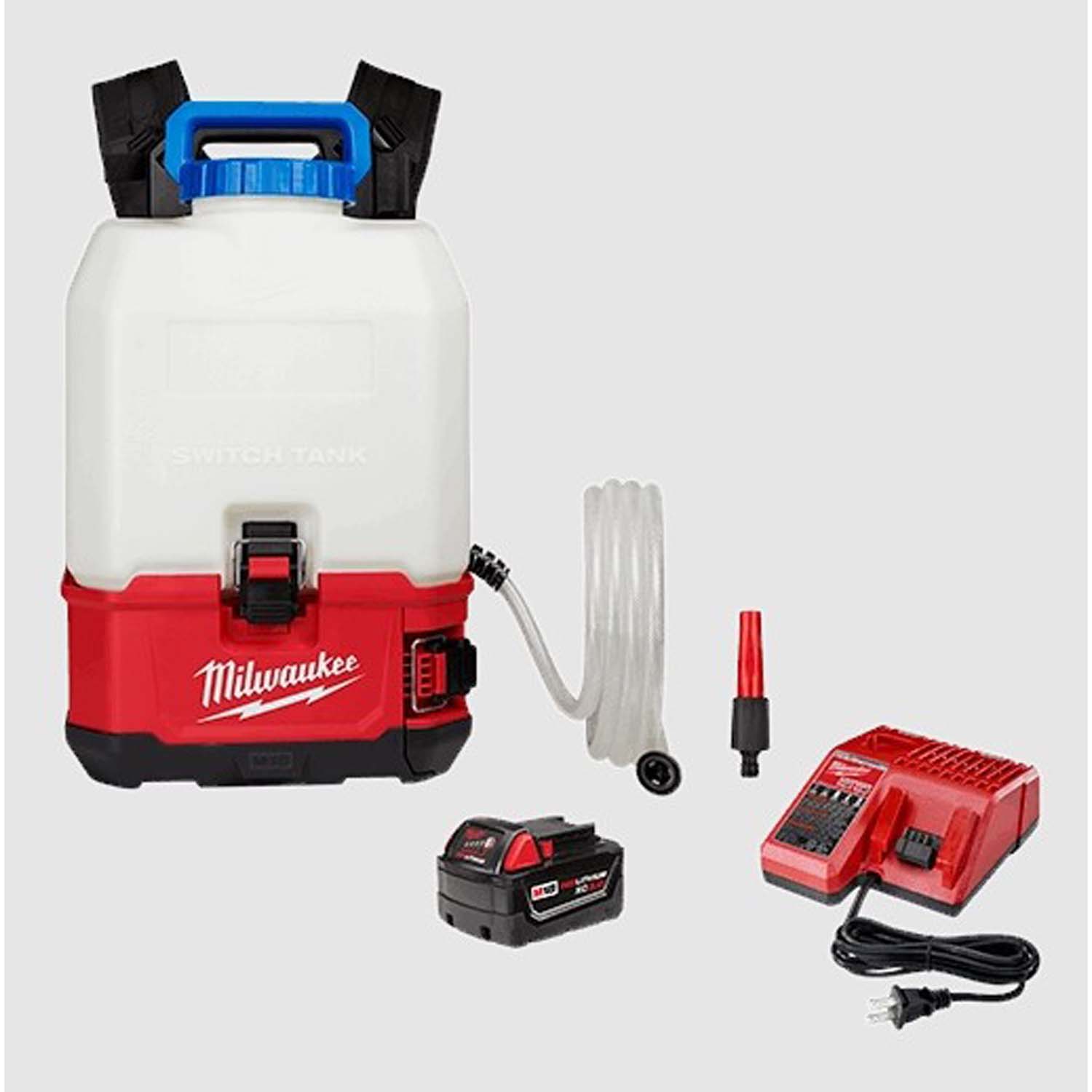 Our M18™ SWITCH TANK™ 4-Gallon Backpack Water Supply kit delivers the industry’s first interchangeable tank design with no manual pumping. Designed to meet your water supply needs for concrete cutting and coring, the battery-powered water supply delivers instant, constant and adjustable pressure up to 60 PSI. The 5-mode pressure regulator adjustment knob adjusts the pressure between 20 – 60 PSI for ultimate control. The M18™ REDLITHIUM™ XC3.0 Battery provides you with up to 12 tanks of water delivery per charge. The 4-gallon water supply tank features a dual diaphragm pump for increased durability and longer pump life. The tank also has a wide mouth opening for easier pouring and a strainer that filters debris from getting into the tank. The backpack frame includes wide straps and a handle providing you with convenient transportation and storage. The 4-Gallon Water Supply is made up of two components – the M18™ SWITCH TANK™ Powered Base and the SWITCH TANK™ 4-Gallon Water Supply Tank Assembly. The Powered Base includes the motor, battery compartment, and REDLINK™ electronics, while the interchangeable Tank Assembly includes the pump, 10ft hose, and quick-connect. The isolated pump, hose, and quick-connect design allows you to add on tank assemblies for different applications, eliminating cross-chemical contamination. It also provides you with the ability to replace the tank assembly at a lower cost of ownership compared to replacing the entire water supply. The Powered Base is also compatible with the SWITCH TANK™ 4-Gallon Concrete Sprayer (49-16-28CS) and 4-Gallon Sprayer (49-16-28PS) Tank Assemblies. The M18™ SWITCH TANK™ 4-Gallon Backpack Water Supply is part of the M18™ system which is fully compatible with over 175 tools. In addition to the backpack water supply, the kit includes one M18™ REDLITHIUM™ XC3.0 Battery and an M18™/M12™ Multi-Voltage Charger.