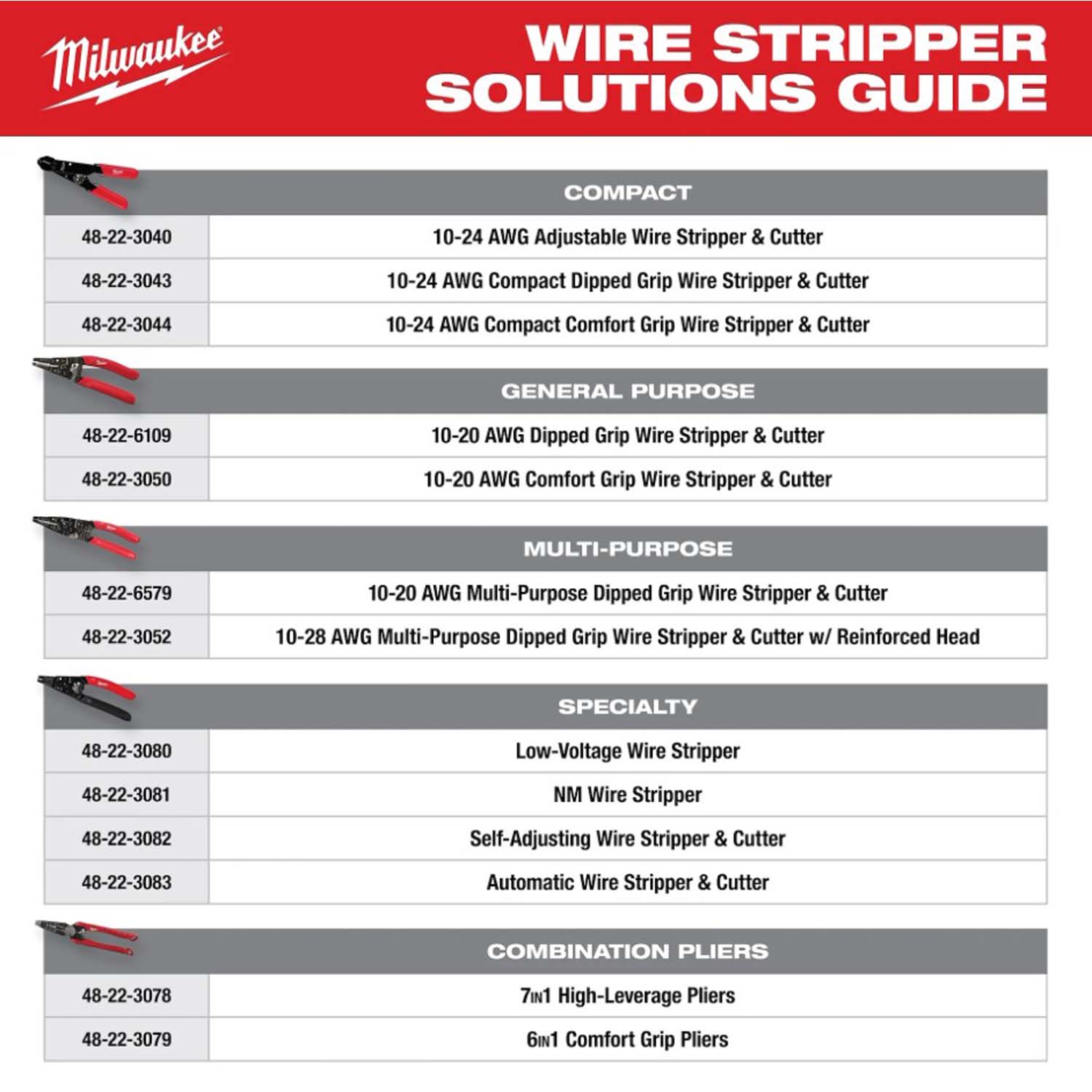 The MILWAUKEE® Multi-Purpose Wire Stripper with Crimper are a fast, one-headed operation to use. These pliers provide the user ultimate versatility, from wire stipping, cutting, and crimping to bolt cutting. The cutting and stripping holes are positioned in front of the pivot to easily fit into tight spaces. The ergonomic handles and spring loaded design make this tool comfortable to use.