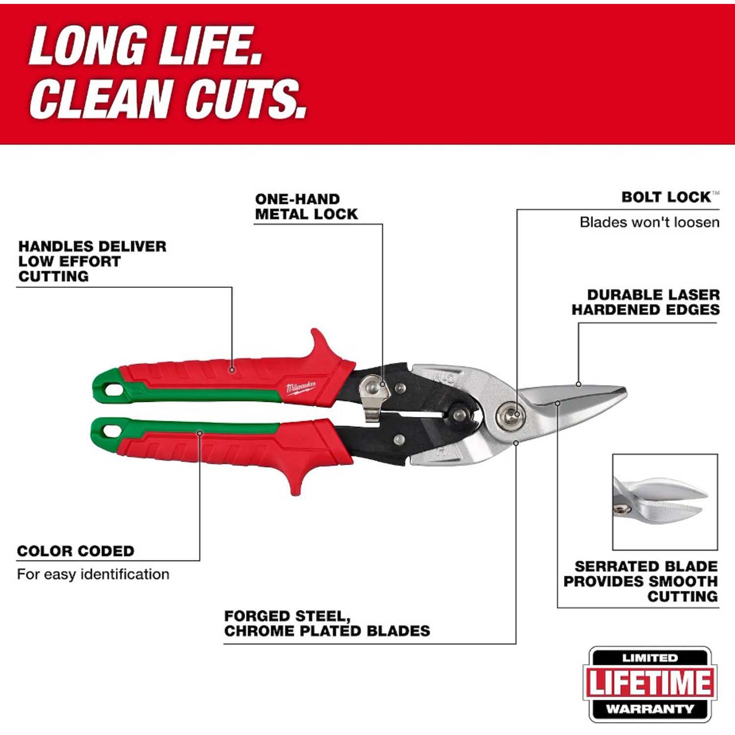 Our Right Cutting Aviation Snips are built for long life and clean cuts. Forged blades with laser-hardened edges are durable and deliver long life. Sharp, serrated blades provide smooth and clean cuts. Our handles are designed to deliver easy, low-effort cutting. BOLT LOCK™ ensures the blades won't loosen and chrome plating provides rust protection. The color-coded handles allow for easy identification on the job. The metal lock secures the tool for storage and is easily operated with one hand. These snips are ideal for making straight, left, or right cuts.